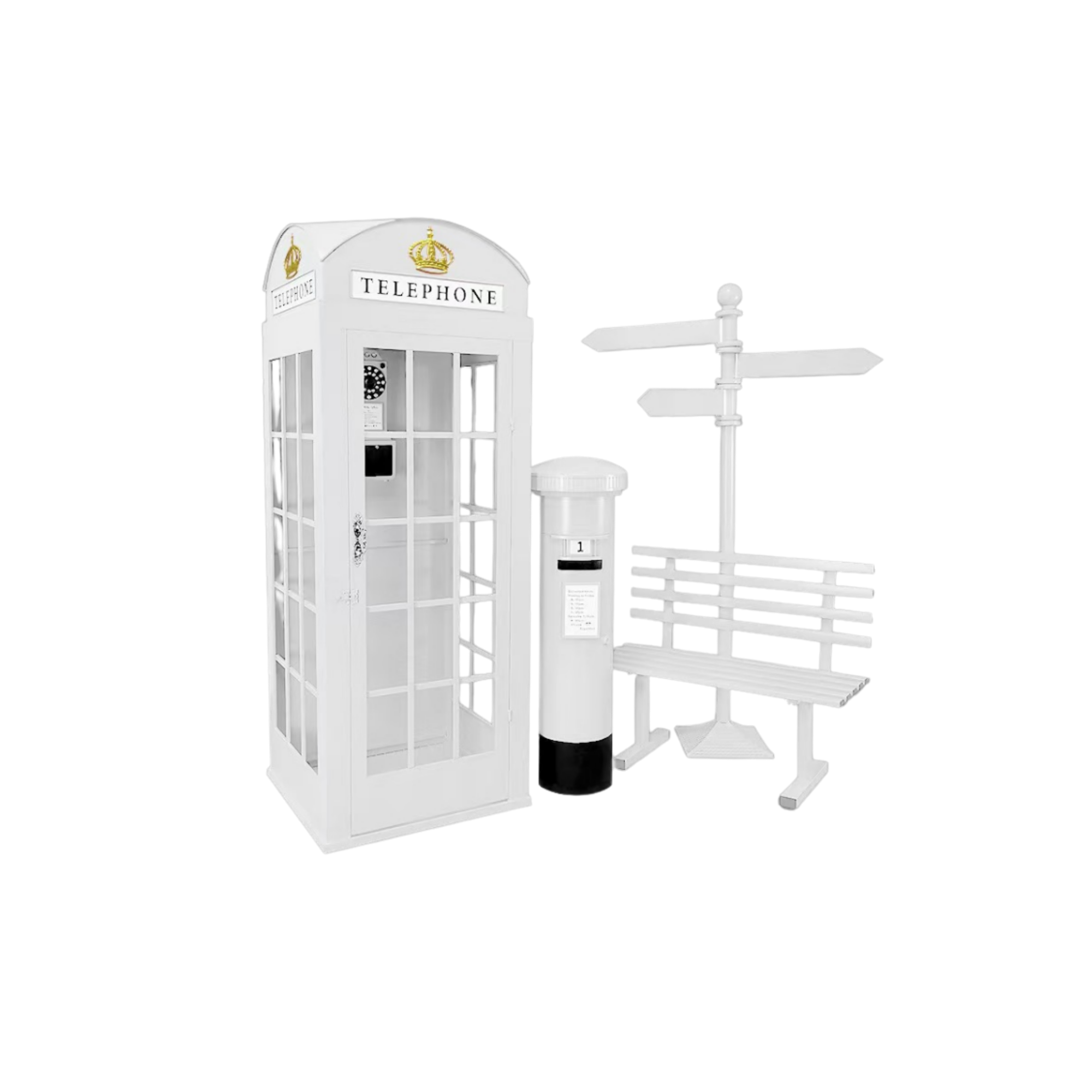 Bring a slice of London to your event with our statement phone booth prop — complete with bench, mailbox, and street sign posts. Perfect for weddings, engagements, birthdays, or any party looking for a fun, interactive photo spot.